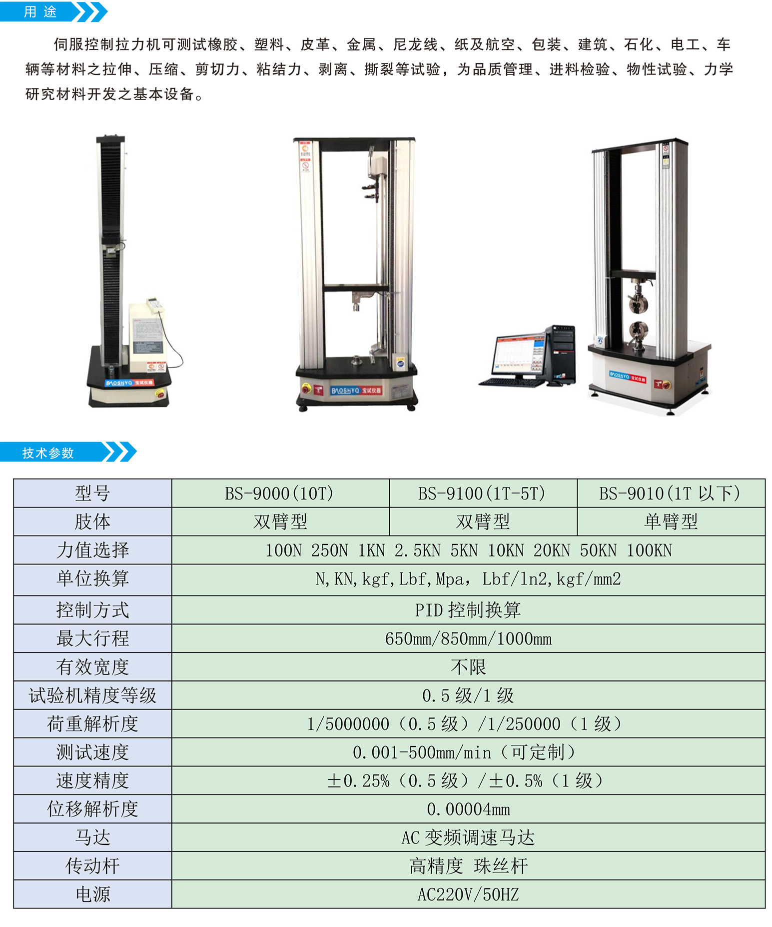 伺服控制拉力机可测试橡胶、塑料、皮革、金属、尼龙线、纸及航空、包装、建筑、石化、电工、车 辆等材料之拉伸、压缩、剪切力、粘结力、剥离、撕裂等试验,为品质管理、进料检验、物性试验、力学 研究材料开发之基本设备。