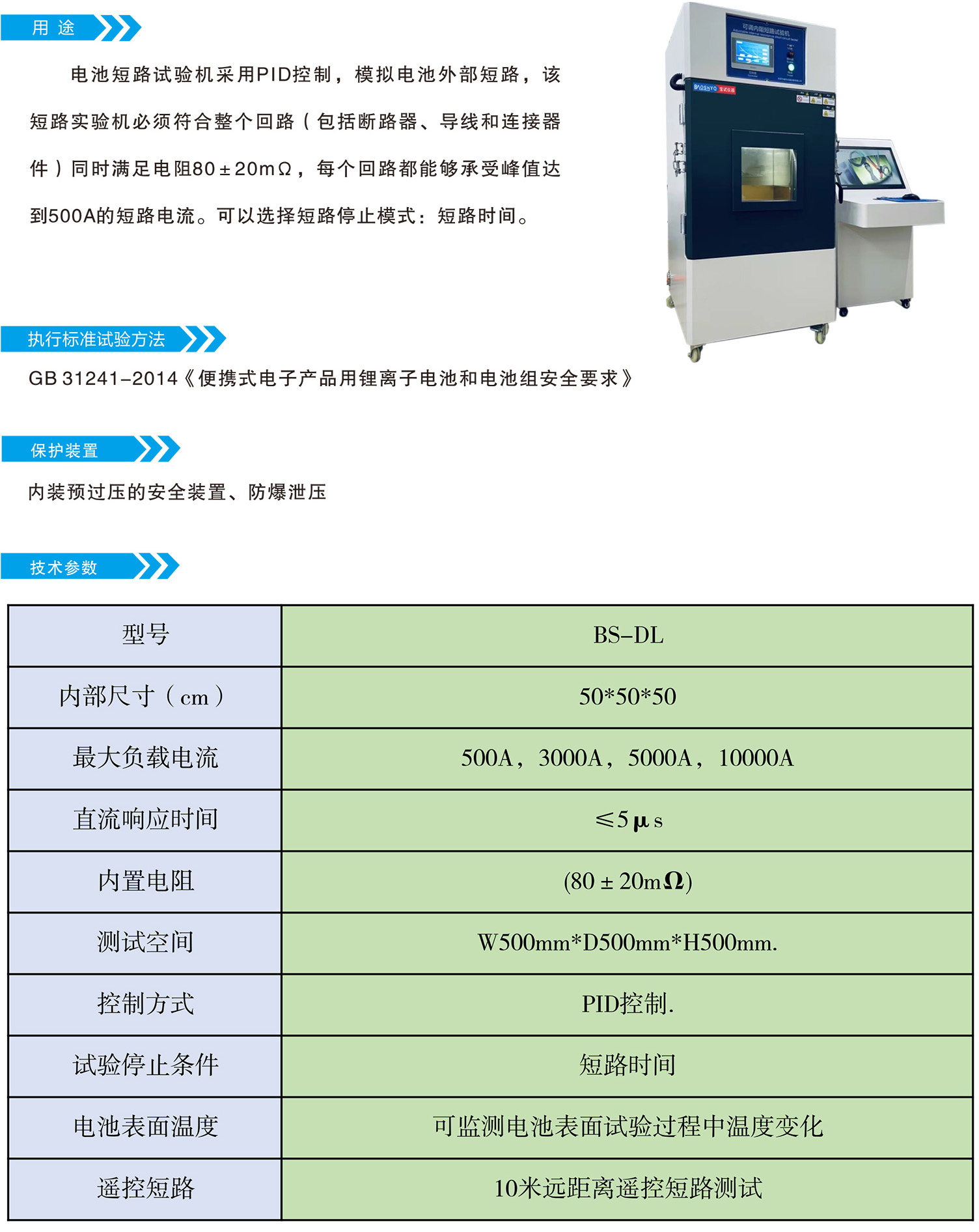 电池短路试验机采用PID 控制,模拟电池外部短路,该 短路实验机必须符合整个回路(包括断路器、导线和连接器 件)同时满足电阻80±20mΩ, 每个回路都能够承受峰值达到500A的短路电流。可以选择短路停止模式:短路时间。